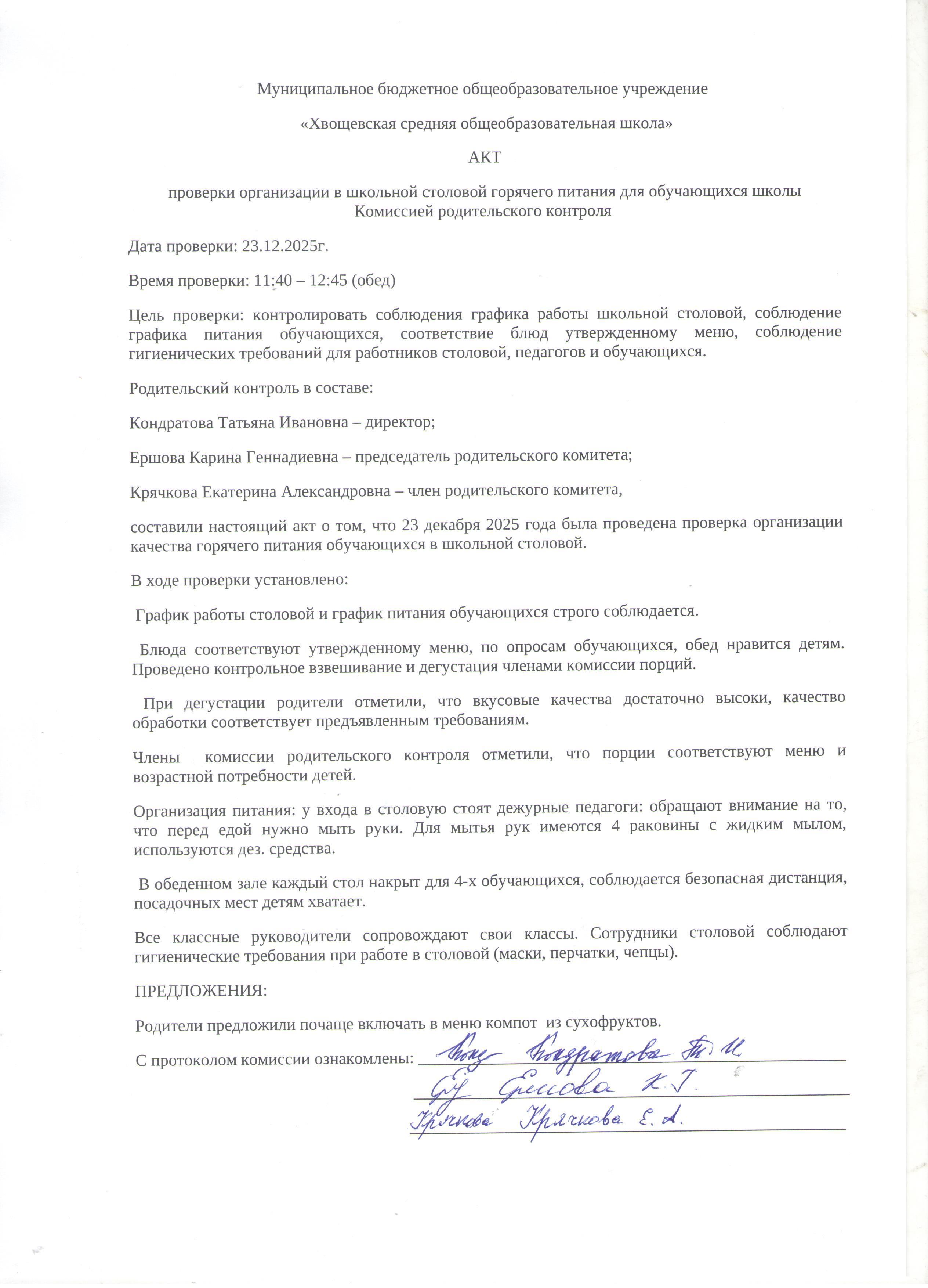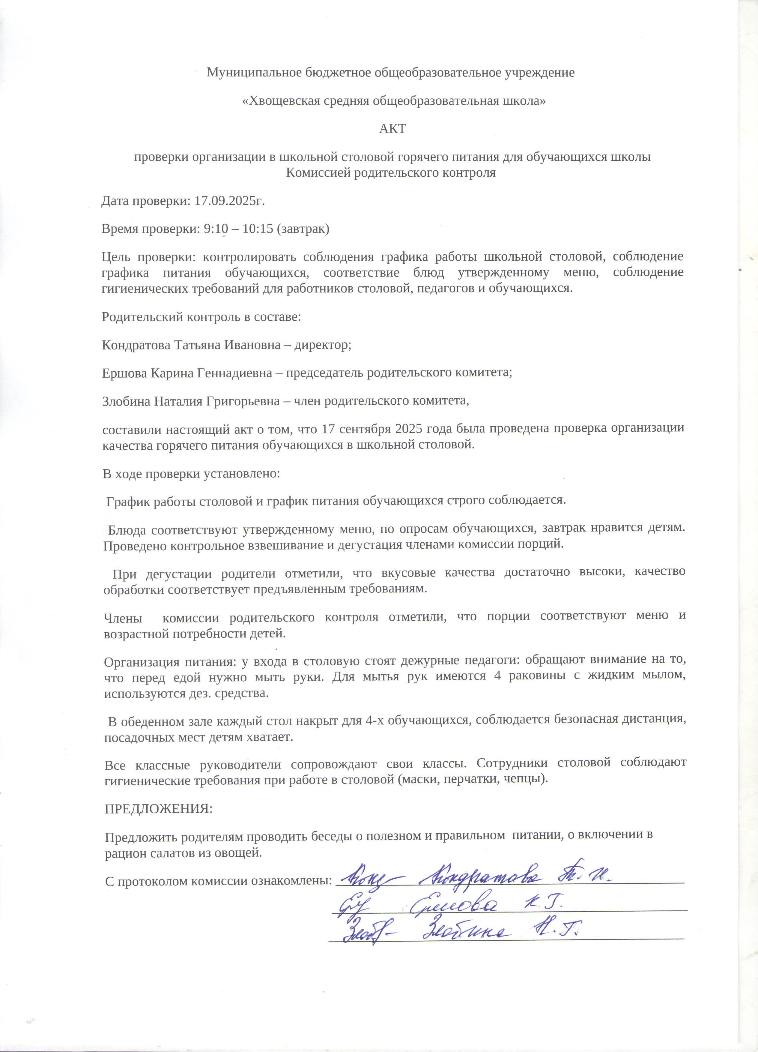 Члены Комиссии по контролю организации и качества питания обучающихся